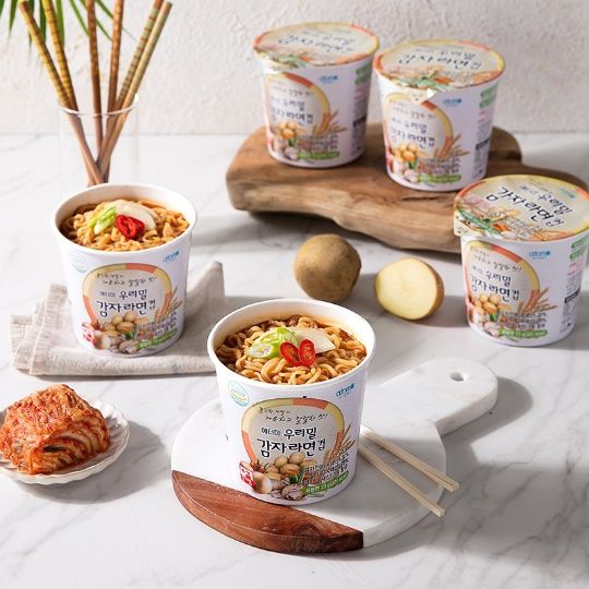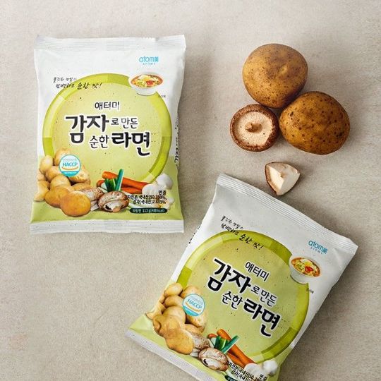 Лапша сделана из картофельной муки, еще более тонкая - 1,3 мм, лучше передает вкус. Дополнен вкус - рисовой мукой, сушеными овощами, экстрактом говяжьего бульона и соевым соусом