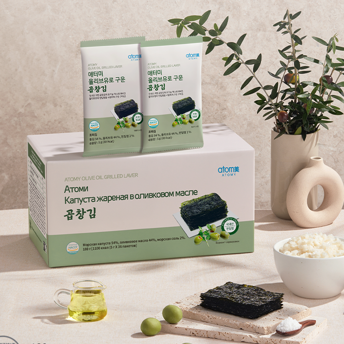 в 100% органическом оливковом масле Extra Virgin. Изготовлен из чистых корейских водорослей, собранных в Сочхоне и Хенами, и приправлен натуральной солью из Кореи. Более 50